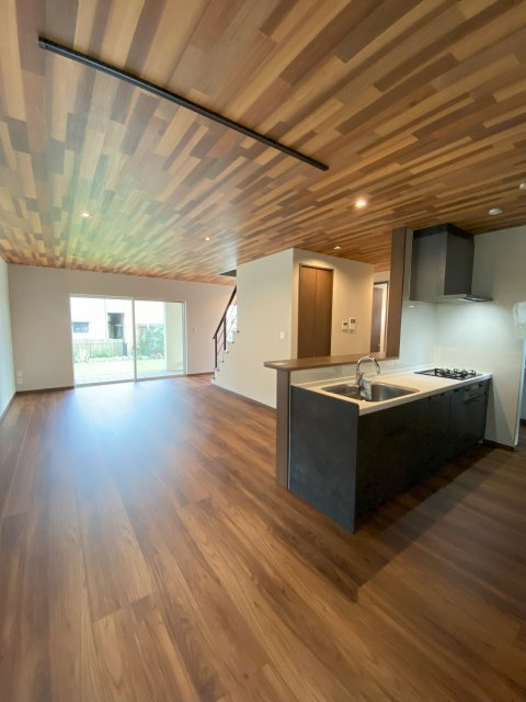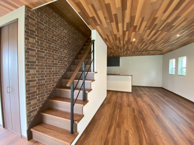 - 天井と階段のアクセントクロス。ウッドデッキと外構のアメリカンフェンス、ロックガーデン。